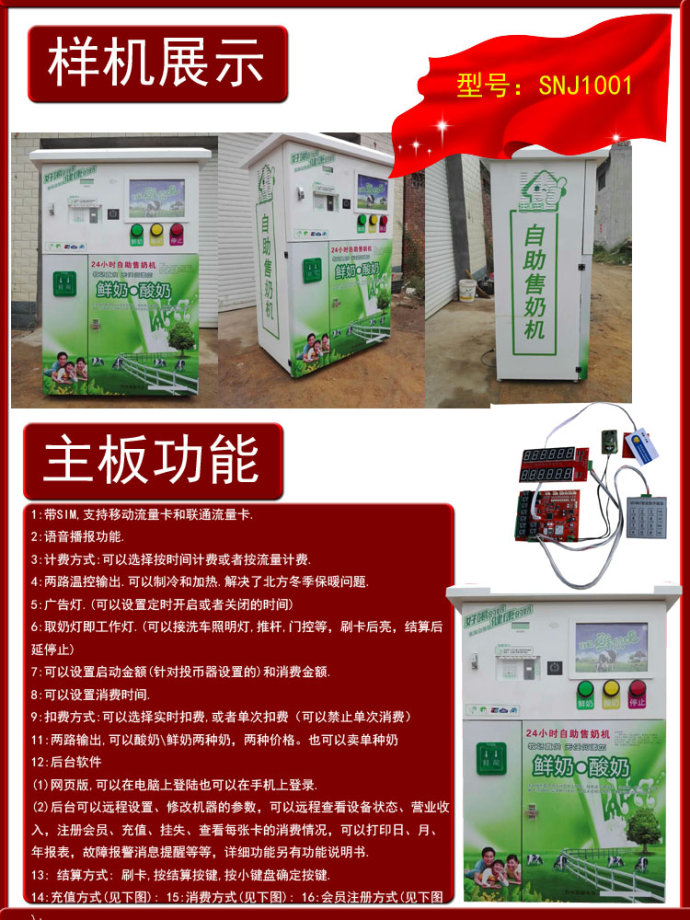 广州宇脉电子自助售奶机主板,联网管理,网页版,支持手机或者电脑登录。可以售卖鲜奶、纯牛奶、酸奶。通过投币、刷卡、微信或者支付宝进行支付,支付后就可以启动设备。多种支付方式给消费者提供更好的便利。相对于投资者来说,这些功能会给你们带来更多的好处:联网管理,通过客户端前台、后台软件,对机器的设置、实时查询、添加、更改、对卡的设置、充值、挂失、补卡、办卡、查询等。对年月日报表查询,对操作人员的管理等。对于设备,可以远程开机锁机,当设备出现状况时,不用亲自到现场进行开机/锁机,远程就可以操控设备。广告灯的时间可以通过自助后台设置开启与关闭的时间。设备出现故障,有短信发送到经营者绑定的手机号上,实时对设备就进行远程检测。每一笔资金变动,都会有短信报账。无水压短信提醒、温度短信、语音播报、温度控制等功能。